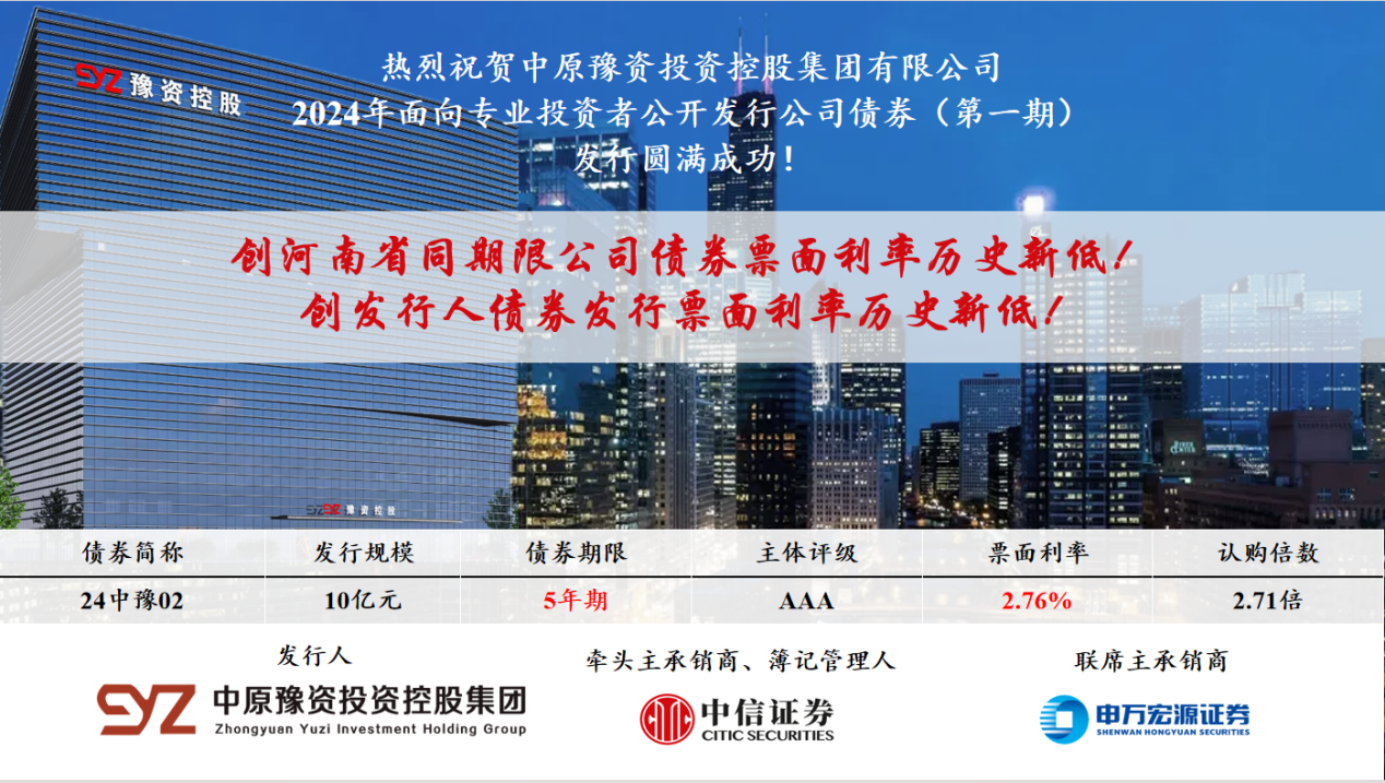 熱烈祝賀中原豫資投資控股集團有限公司2024年面向?qū)I(yè)投資者公開發(fā)行公司債券(第一期)發(fā)行圓滿成功!2024年3月6日,中原豫資投資控股集團有限公司(以下簡稱“本集團”“豫資控股集團”)2024年面向?qū)I(yè)投資者公開發(fā)行公司債券(第一期)(以下簡稱“本期債券”)成功簿…...
