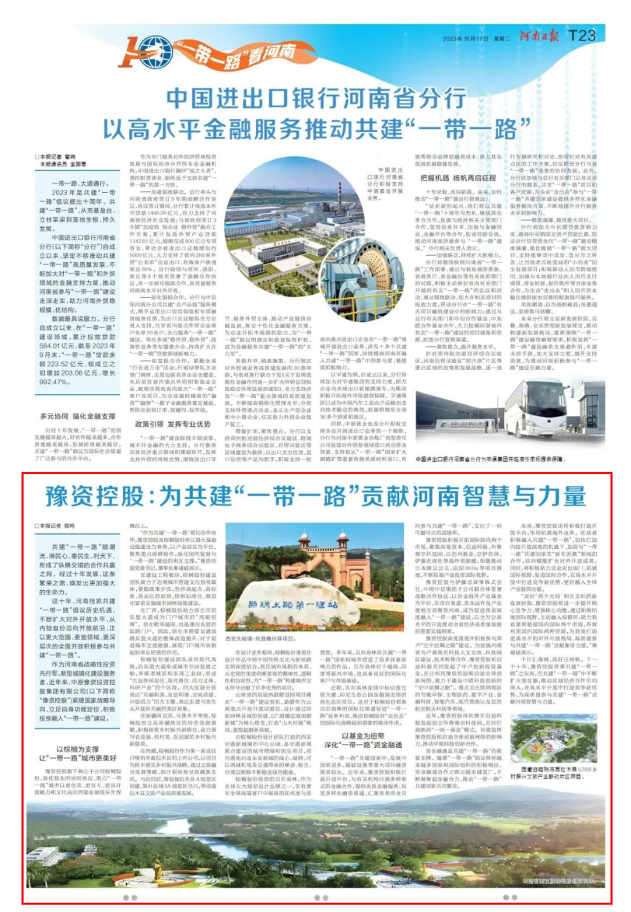 10月17日,河南日報發(fā)表專版文章——“豫資控股:為共建一帶一路”貢獻河南智慧與力量”,詳細報道了豫資控股近年來緊隨國家戰(zhàn)略導向,立足自身功能定位,積極參與融入“一帶一路”建設提供的支撐及取得的成果?,F(xiàn)將全文分享如下:共建“ 一帶一路”順潮流、得民心、惠民…...